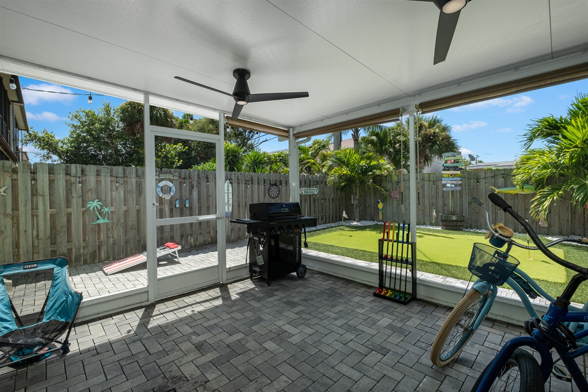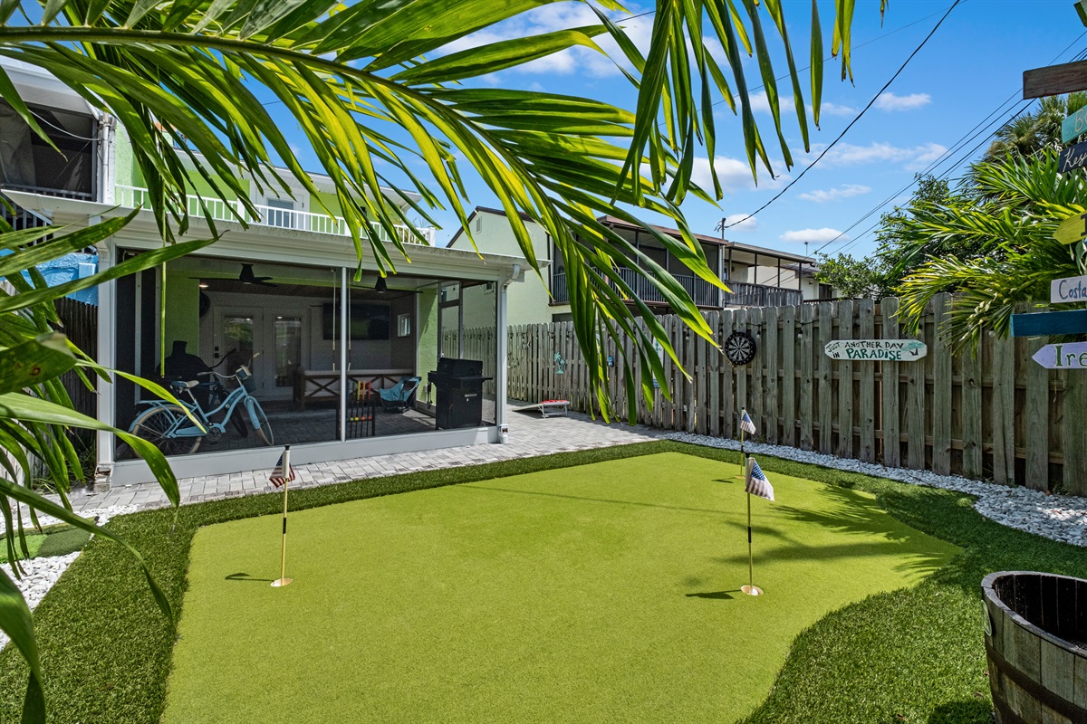 This is where memories are made. The covered patio is a true outdoor living room, complete with a comfortable couch, an outdoor TV, and a propane grill —perfect for game days and breezy evening cocktails. In the fully fenced backyard, a private putting green offers hours of friendly competition and fun.