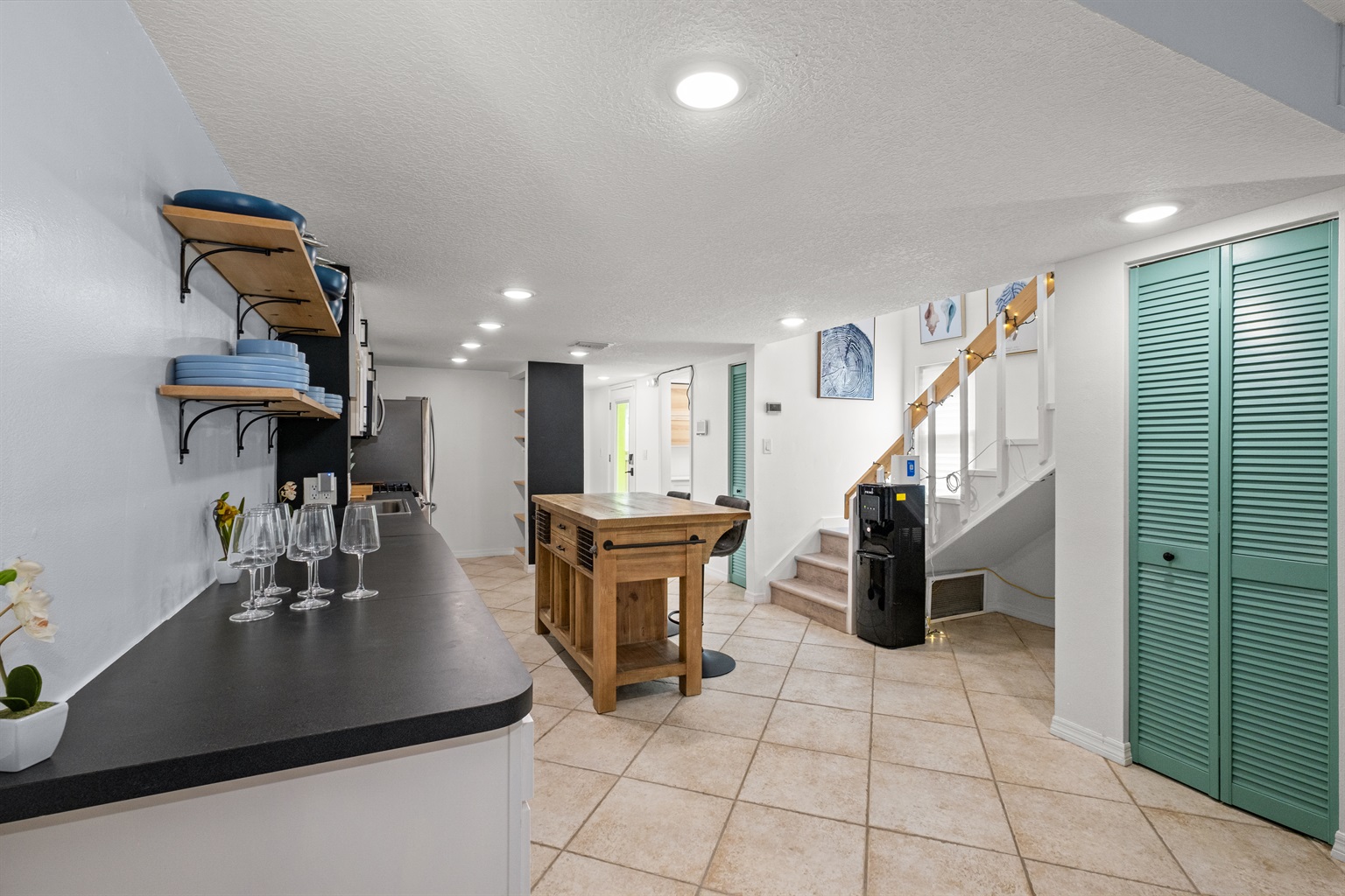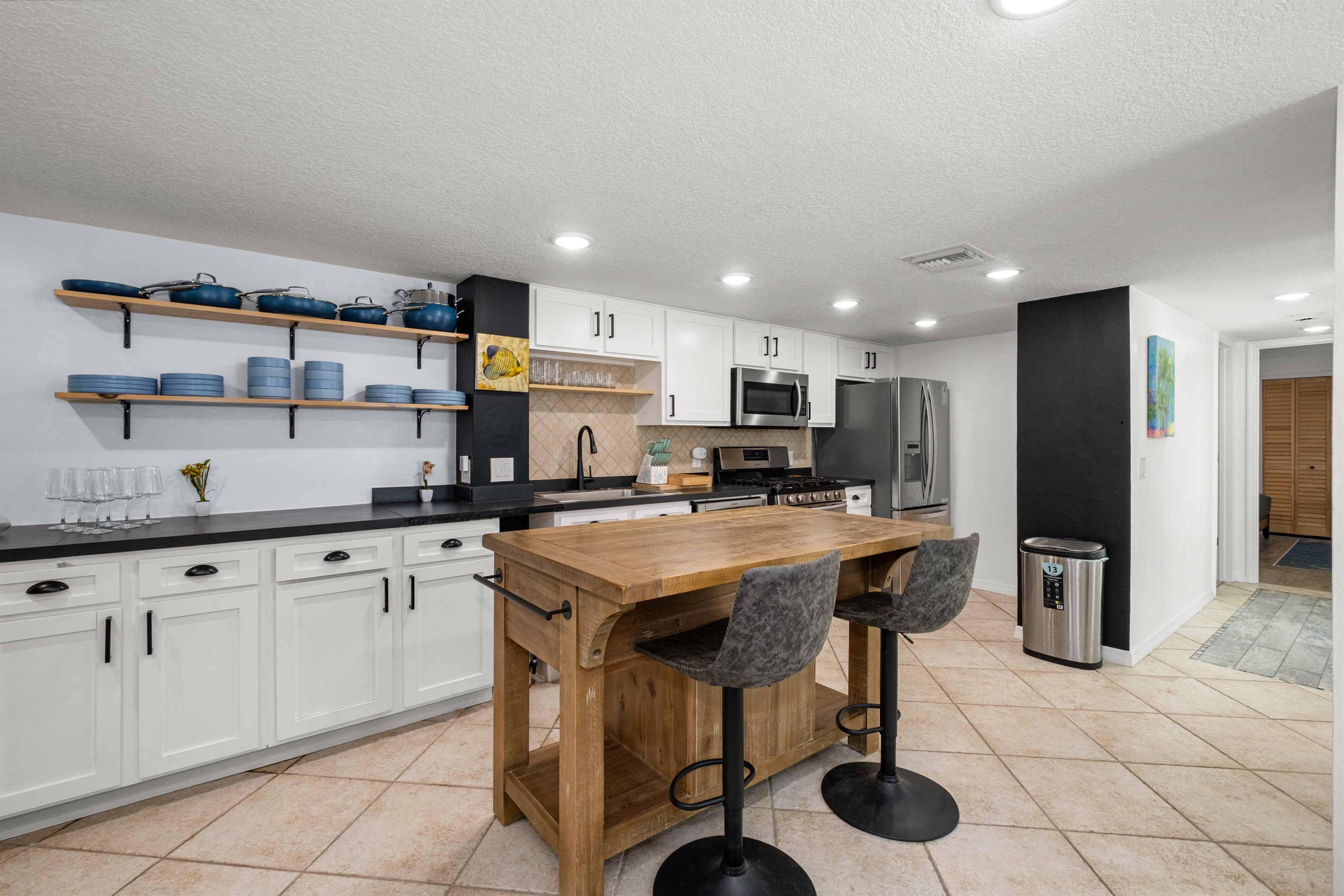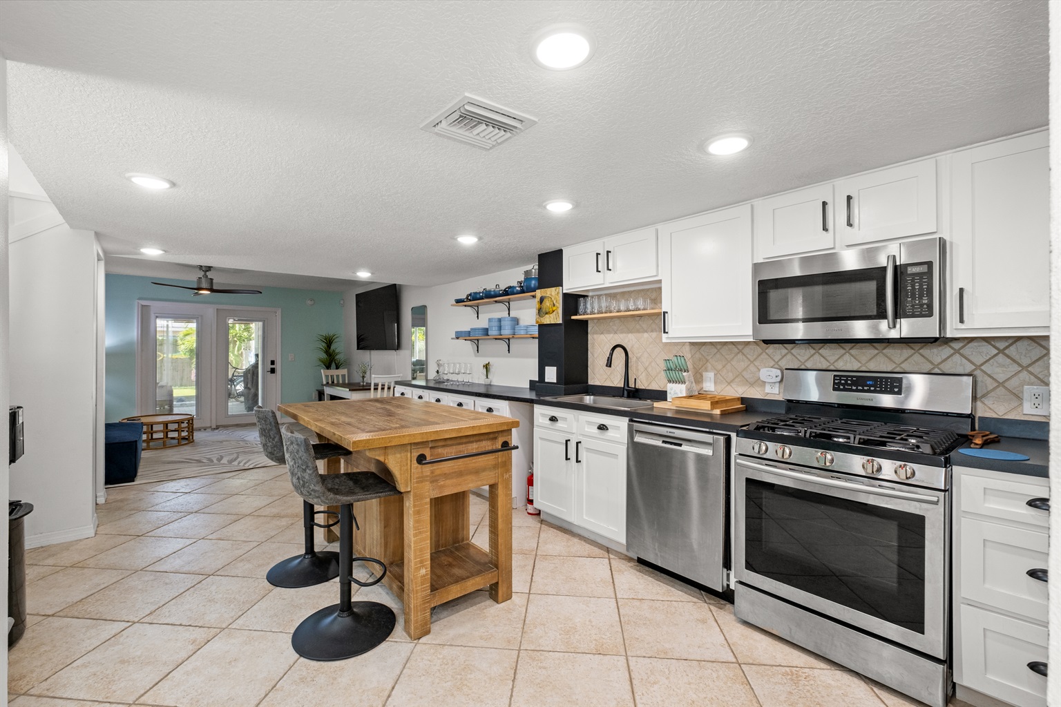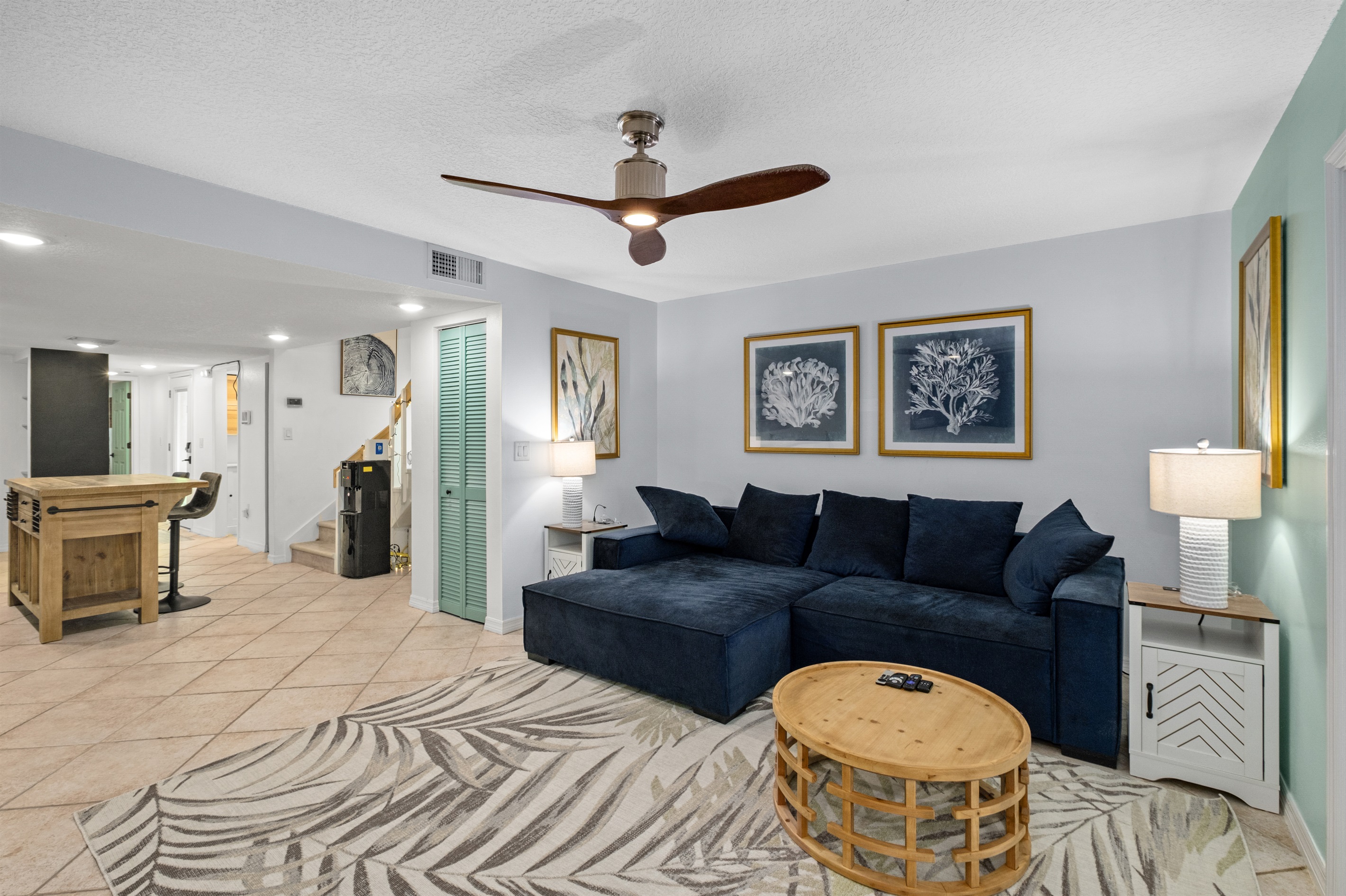 Designed for socializing, the open-concept living space is the perfect place to gather after a day in the sun. Unwind on the plush sectional for a movie night on the 65” Hisense Smart TV , while the central A/C keeps everyone cool. The sleek, fully-equipped kitchen, featuring stainless steel Samsung and Bosch appliances and a L'OR Barista coffee system, is ready for everything from quick breakfasts to celebratory dinners.