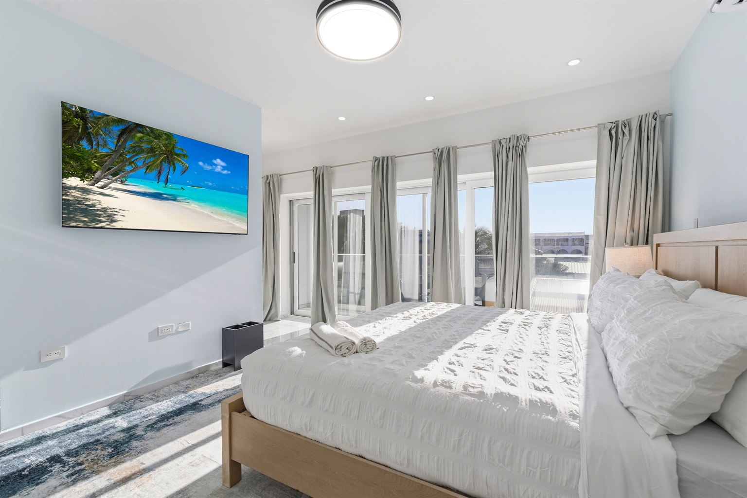 Primary Suite- A calming sanctuary with a King bed, soft blue accents, and balcony access through floor-to-ceiling glass. The ensuite offers dual vanities and a spacious rainfall shower.