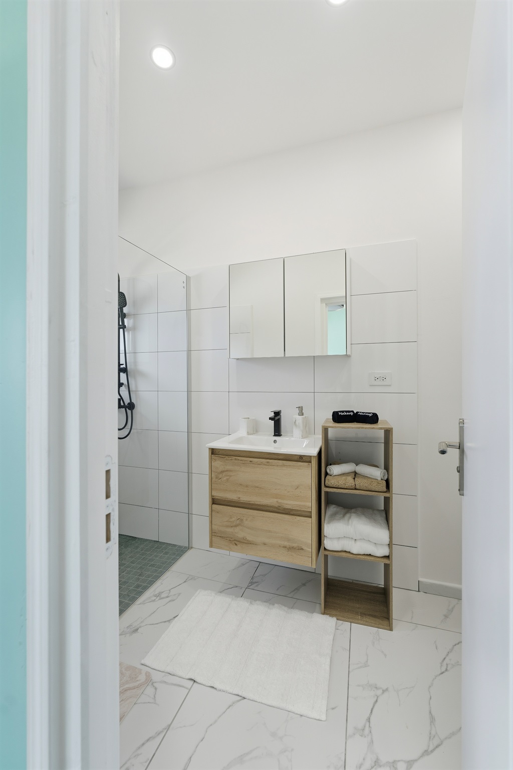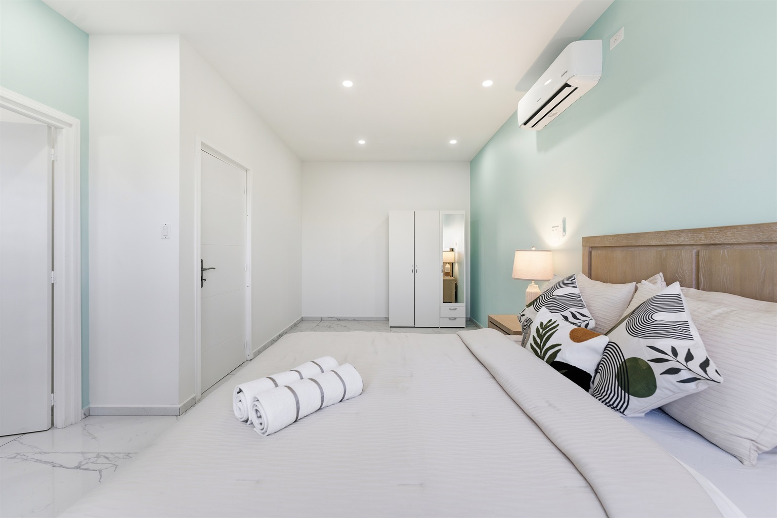 Aviation Suite (Bedroom 2)- A Queen bedroom with mint-green tones and a direct runway view — a rare find for aviation lovers. Includes a private ensuite with a glass shower and modern tilework.