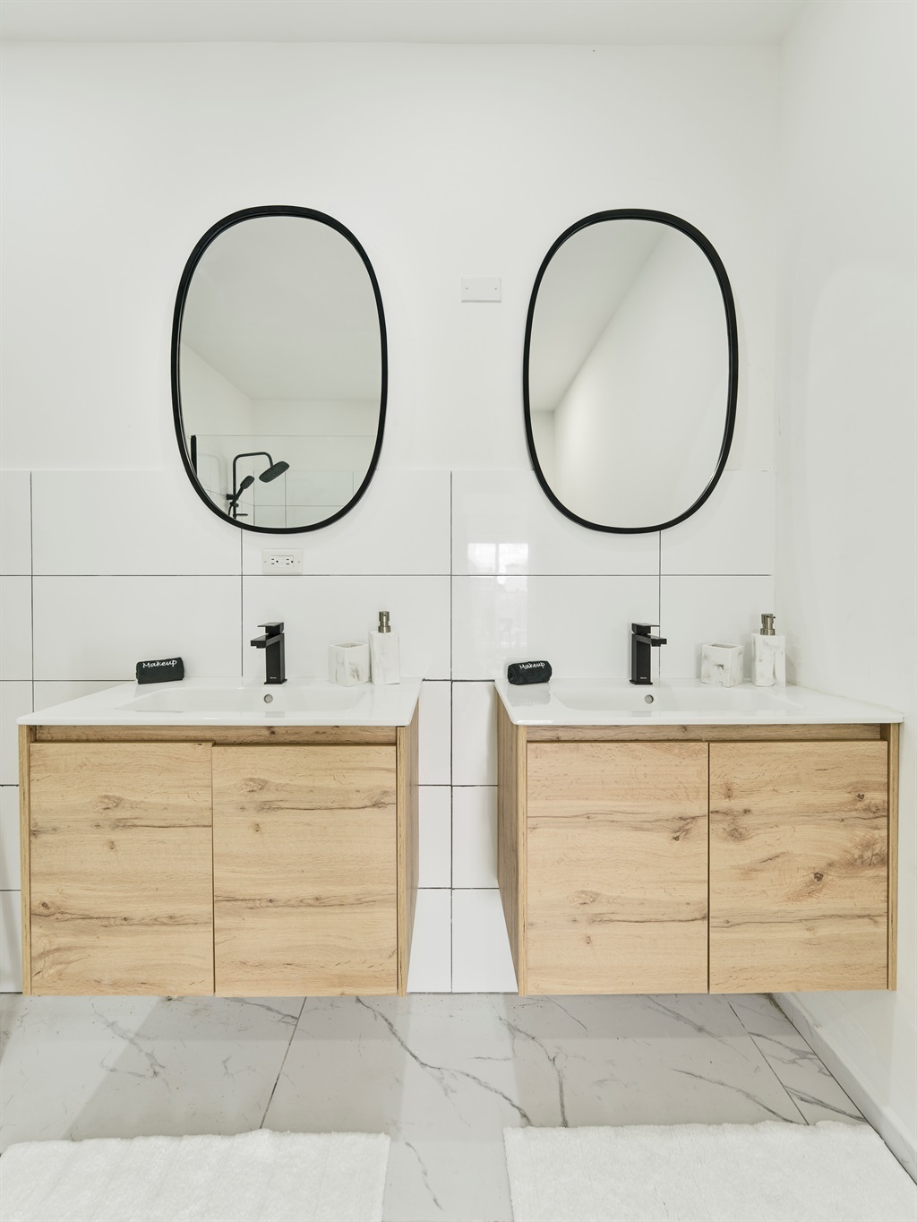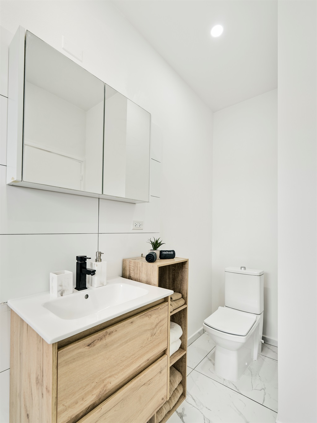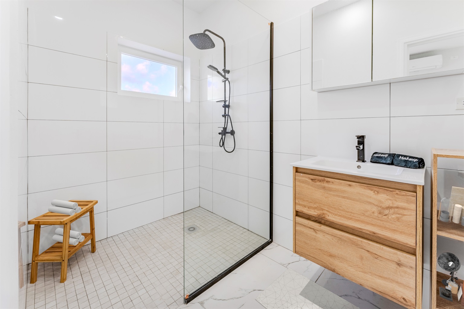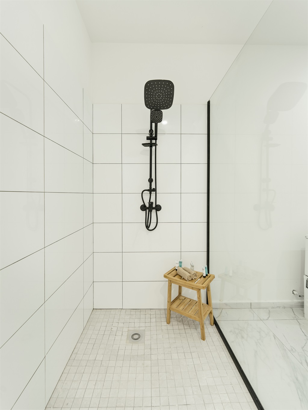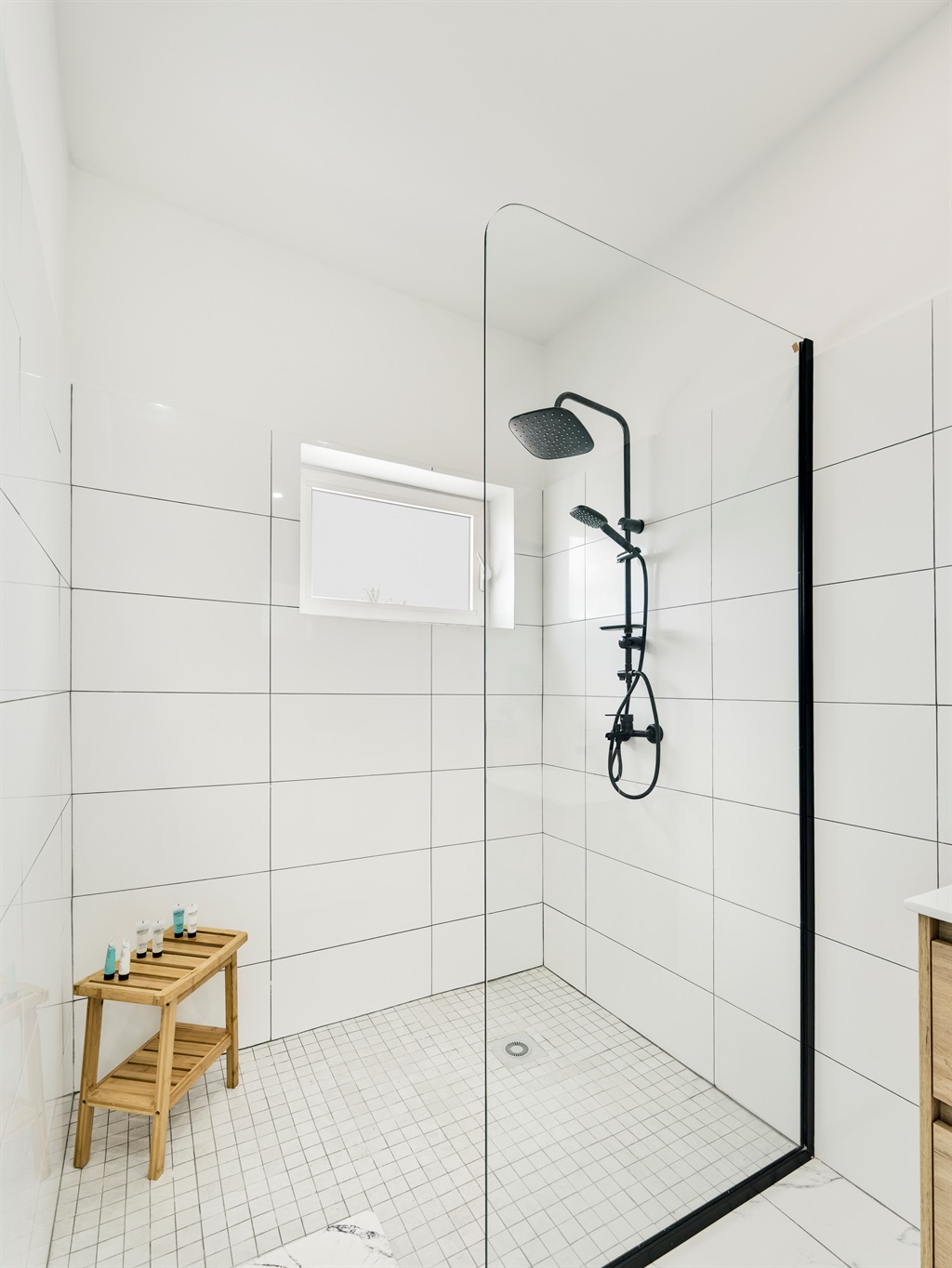 Upstairs, both bedrooms are tranquil retreats. The primary suite features a king bed, rich wood frame, plush linens and a wall of glass leading to a private balcony. The large, en‑suite spa‑style bath has a soothing neutral palette, dual vanities and glass shower. The second bedroom offers a queen bed, ample wardrobe space and its own en‑suite with a large glass shower. A built‑in desk and chair under the staircase provide a dedicated workspace with high‑speed Wi‑Fi, ideal for remote work or study.