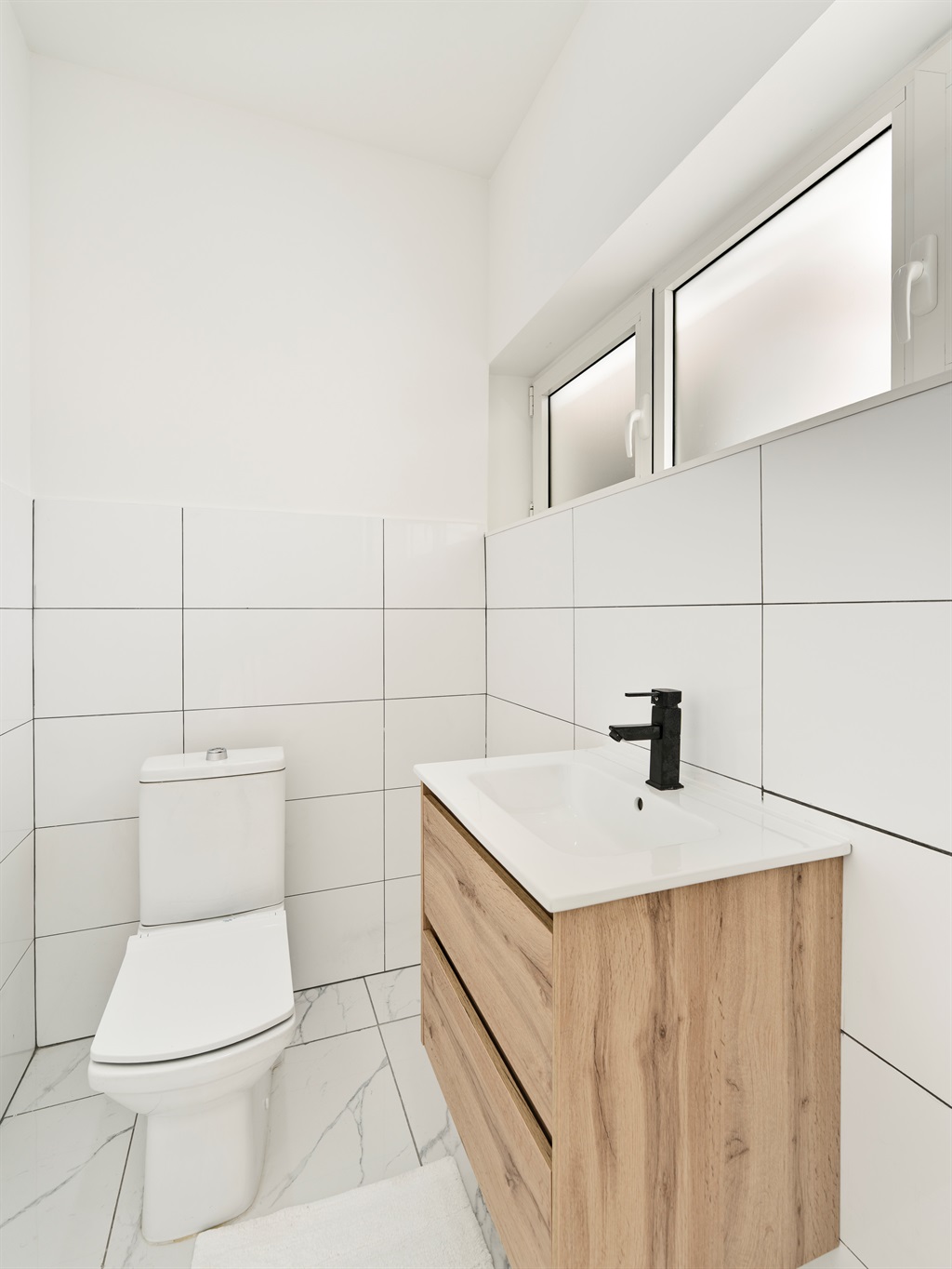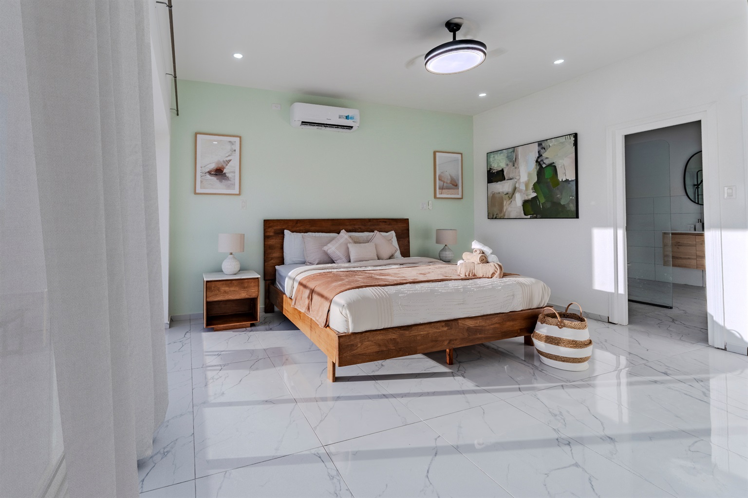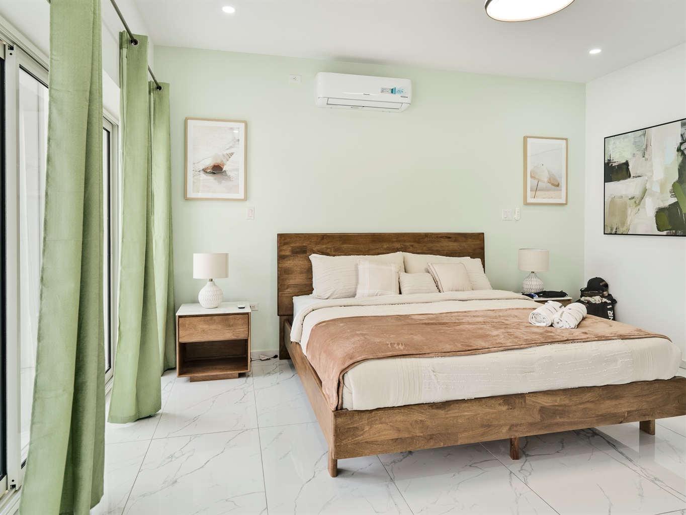 The main level is a bright, open-concept space framed by pastel mint walls and marbled tile floors. A generous sectional invites relaxation, while rattan coffee tables and tropical artwork bring island flair. An 85‑inch smart TV with JBL Soundbar, plants and curated décor create a refined lounge vibe. Slide open the glass doors to your private wood‑decked terrace where cushioned seating and a BBQ grill set the scene for sunset cocktails or morning coffee.